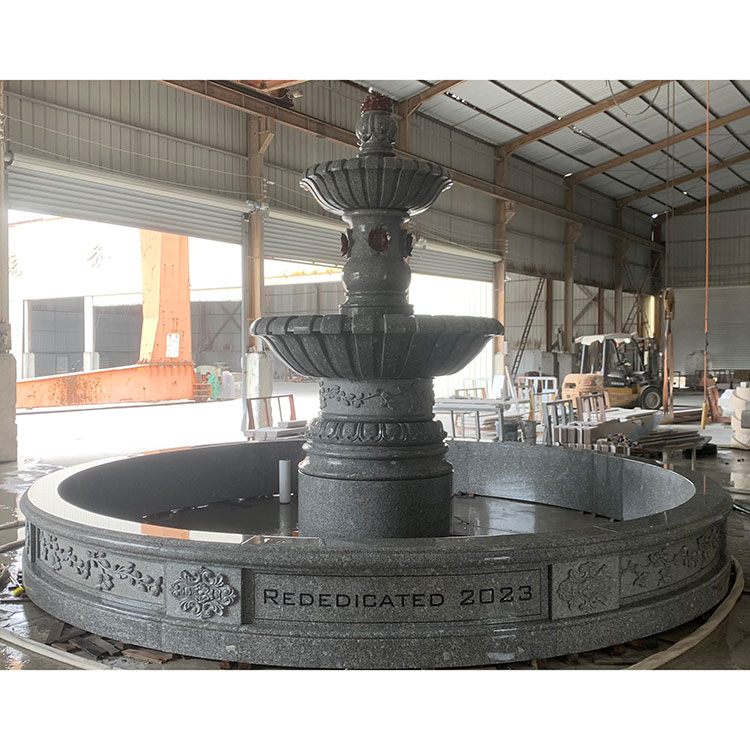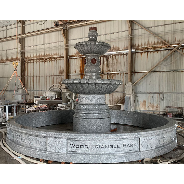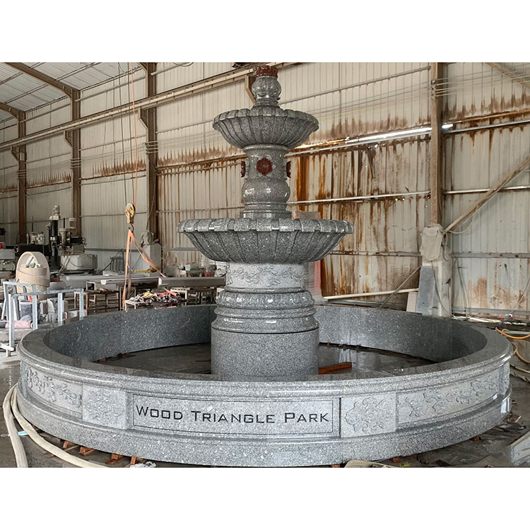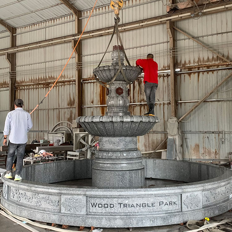 La fontaine qui coule est faite de calcaire importé d'Égypte et est finement fabriquée grâce à une combinaison de machine et de travail manuel. L'eau est pompée de la piscine jusqu'au sommet de la fontaine, où elle est projetée. L'eau s'écoule à travers les niveaux des bassins en pierre et finit dans le bassin de fond. Ce produit est utilisé sur les places, les parcs et les cours.