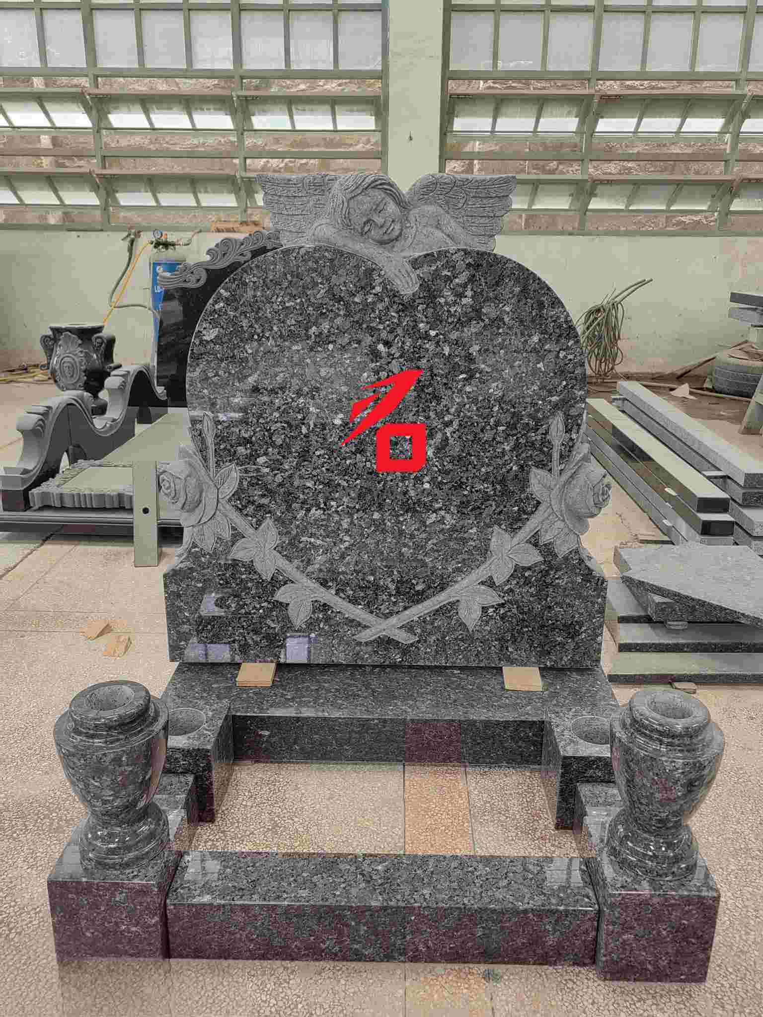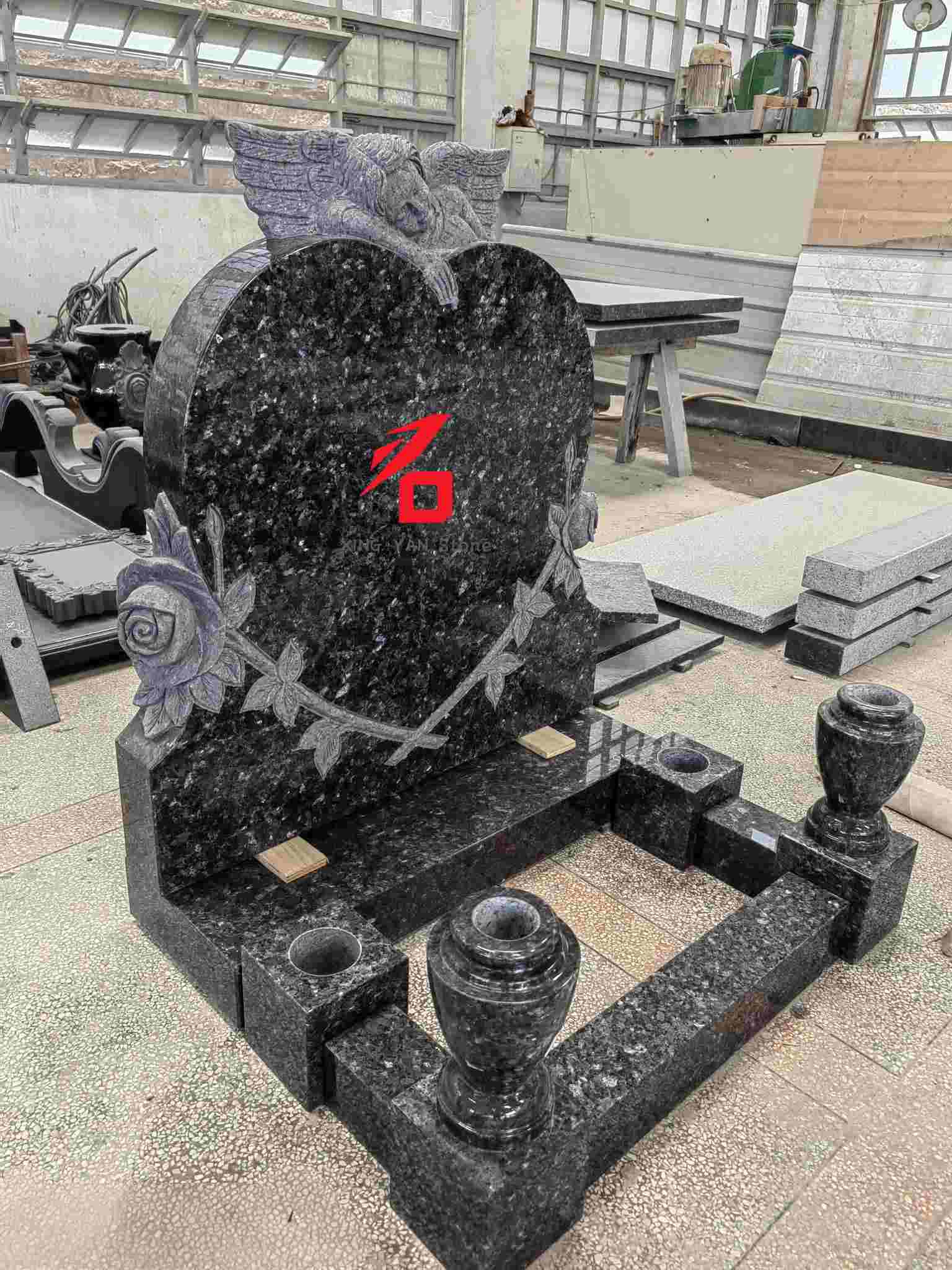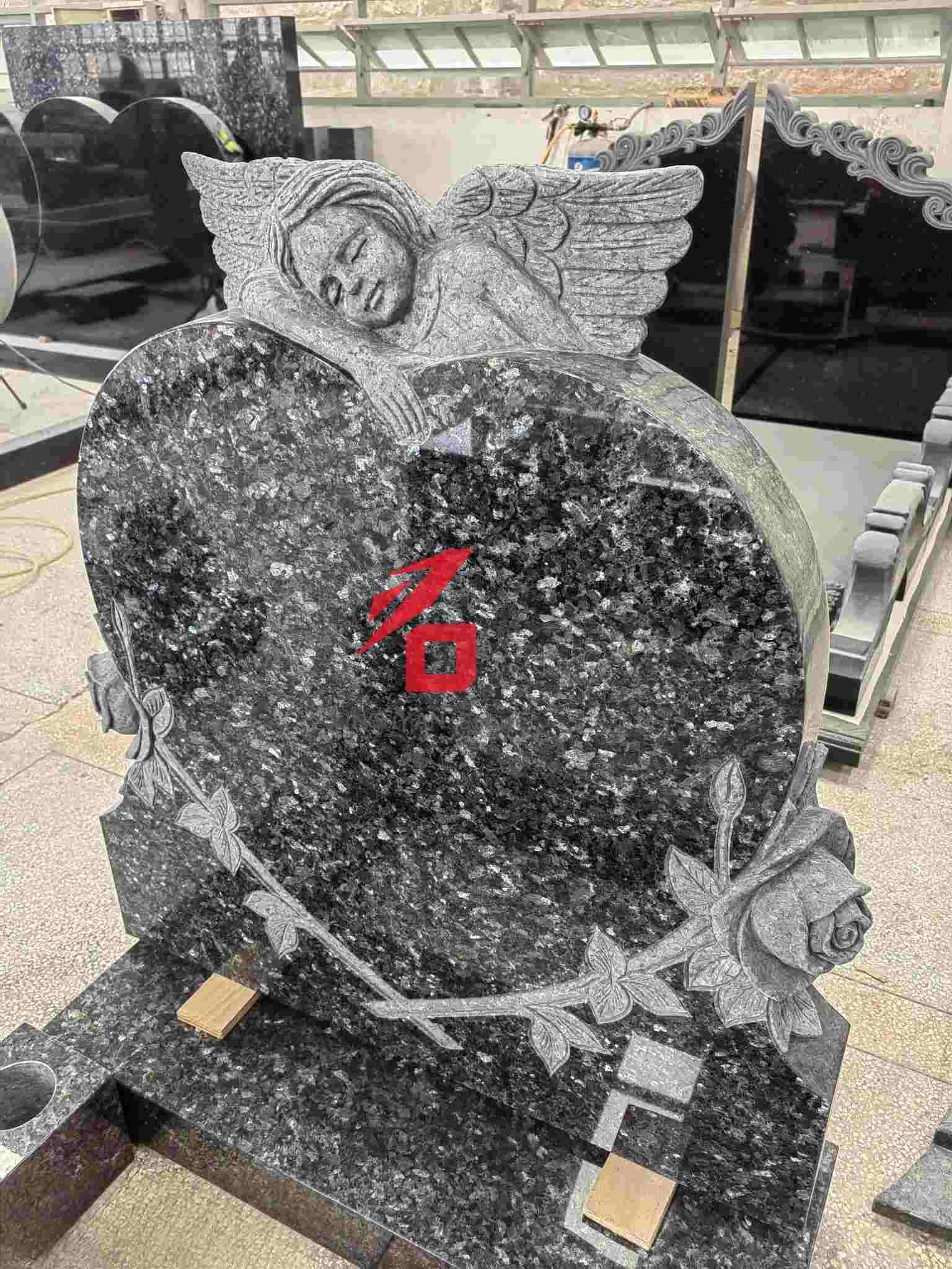 Conception : La pierre tombale principale présente une forme de cœur, surmontée d'une sculpture d'ange et entourée de reliefs de roses. Le style général est chaleureux et commémoratif ;