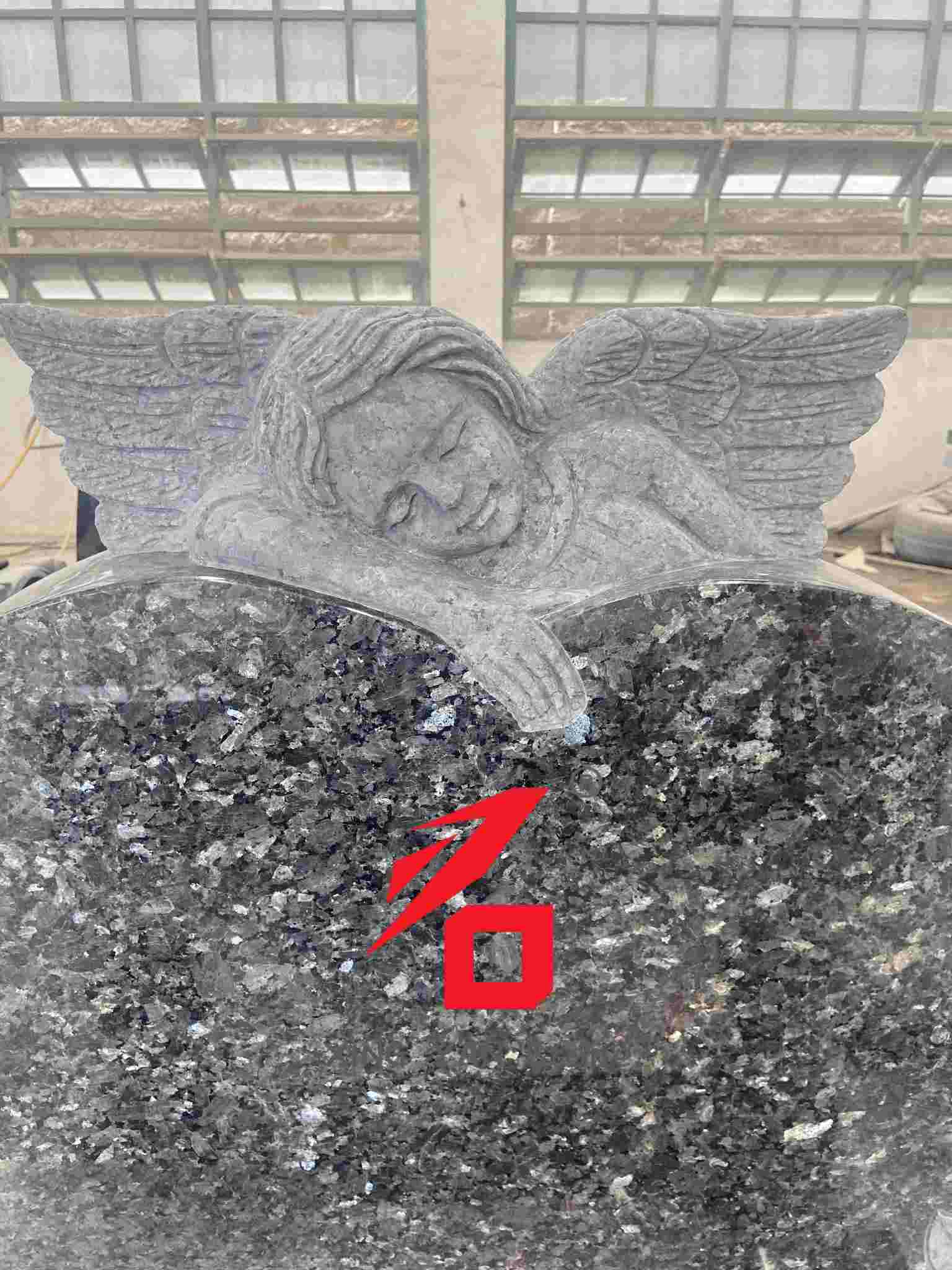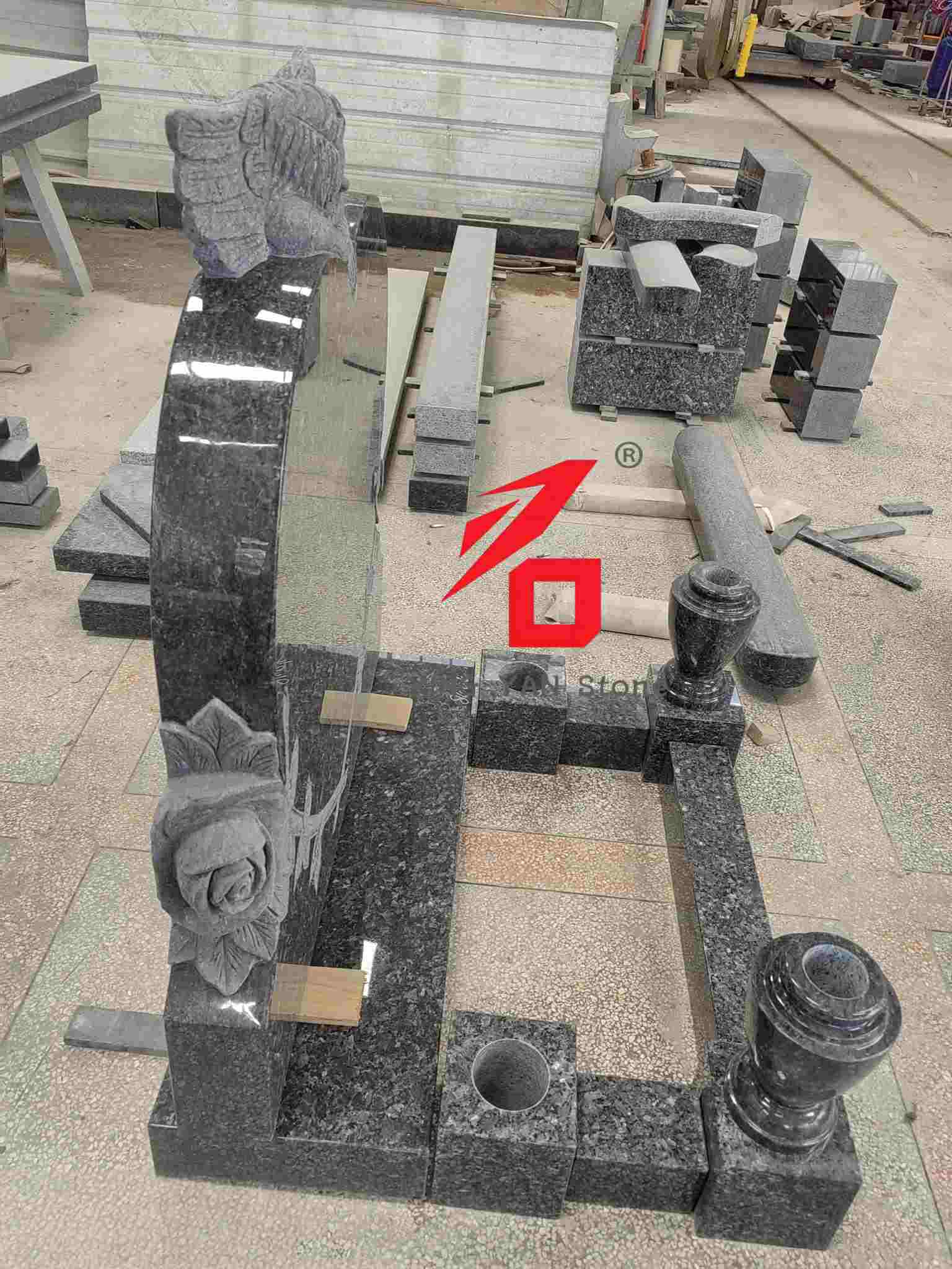 Matériau : granit perlé bleu haute densité, dur et résistant aux intempéries, avec une base sombre qui dégage une sensation solennelle et digne ;